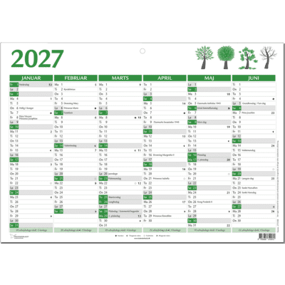 Med en vægkalender har alle i familien mulighed for at få et hurtigt overblik over hele familiens aktiviteter. Vores vægkalendere er både i en udgave med et halvt år på hver side og i en udgave med hele året samlet på en side. Her har du det aktuelle år på den ene side og næste år på den anden side. Begge typer af vægkalendere er selvfølgelig med alle årets helligdage, ugedage, andre vigtige dato informationer samt arbejdsdage hver måned. Derudover er der også angivet, hvor mange lørdage hver måned indeholder. Alt sammen informationer, som er med til at give et nemt overblik over hver måned, uge og dage på året i forhold til planlægning af aktiviteter, ferier og aftaler.