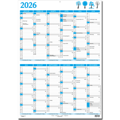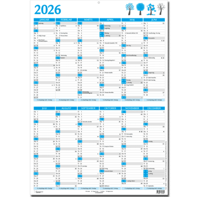 Med en vægkalender har alle i familien mulighed for at få et hurtigt overblik over hele familiens aktiviteter. Vores vægkalendere er både i en udgave med et halvt år på hver side og i en udgave med hele året samlet på en side. Her har du det aktuelle år på den ene side og næste år på den anden side. Begge typer af vægkalendere er selvfølgelig med alle årets helligdage, ugedage, andre vigtige dato informationer samt arbejdsdage hver måned. Derudover er der også angivet, hvor mange lørdage hver måned indeholder. Alt sammen informationer, som er med til at give et nemt overblik over hver måned, uge og dage på året i forhold til planlægning af aktiviteter, ferier og aftaler.