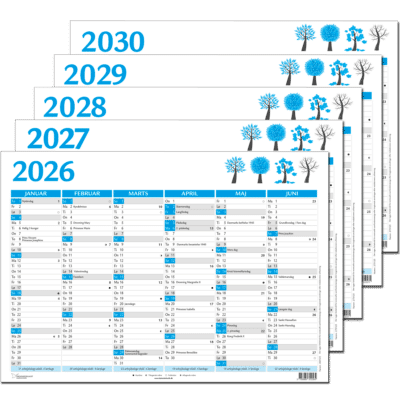 For dig, der gerne vil planlægge længere ud i fremtiden, er vores 5-årskalender til væg en optimal løsning. Her har du en kalender pr. år fra år 2023 og frem til år 2027 med 6 måneder på hver side af kalenderen. Har du en allerede planlagt ferie, stor fødselsdag eller konfirmation nogle år ude i fremtiden kan du med fordel skrive dem i kalenderen allerede nu. Disse 5-årskalendere til væg hjælper dig med at få et overblik over aktiviteter op til de store begivenheder. Her har du ligesom vores øvrige kalendere også overblik over de næste 5 års helligdage, ugedage og vigtige datoer på året for hver måned.