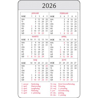 Med en vægkalender har alle i familien mulighed for at få et hurtigt overblik over hele familiens aktiviteter. Vores vægkalendere er både i en udgave med et halvt år på hver side og i en udgave med hele året samlet på en side. Her har du det aktuelle år på den ene side og næste år på den anden side. Begge typer af vægkalendere er selvfølgelig med alle årets helligdage, ugedage, andre vigtige dato informationer samt arbejdsdage hver måned. Derudover er der også angivet, hvor mange lørdage hver måned indeholder. Alt sammen informationer, som er med til at give et nemt overblik over hver måned, uge og dage på året i forhold til planlægning af aktiviteter, ferier og aftaler.