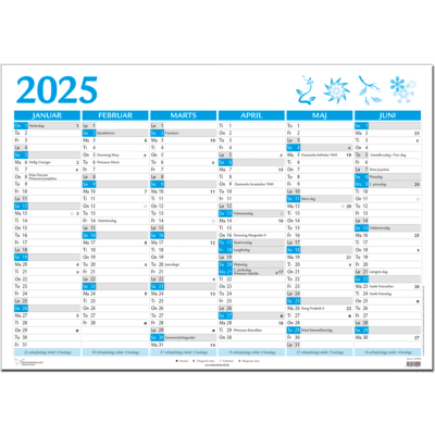 Den store A3 vægkalender i blå har første halvår af 2025 på den ene side og andet halvår 2025 på den anden side.