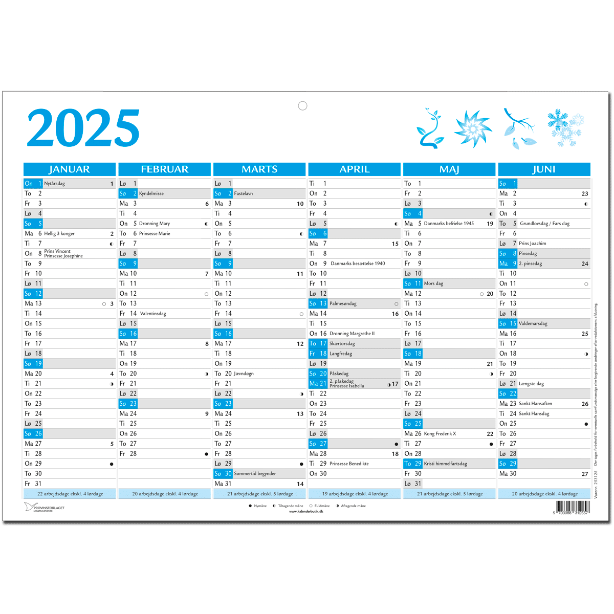 Vores A4 vægkalender er i blå er inddelt med 1. halvår af 2025 på den ene side og 2. halvår af 2025 på den anden side.