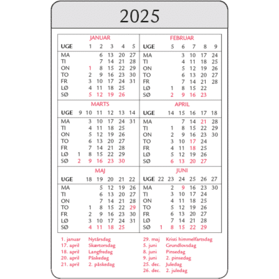 Er der behov for at vide antal hverdags arbejdersdage så er disse også skrevet under hver måned.