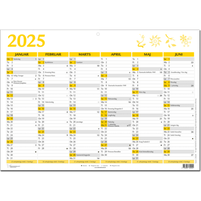 I den gule vægkalender er alle årets helligdage samt nogle af årets vigtige datoer sat ind og markeret med gult. Derudover er alle søndage for året markeret med gul.