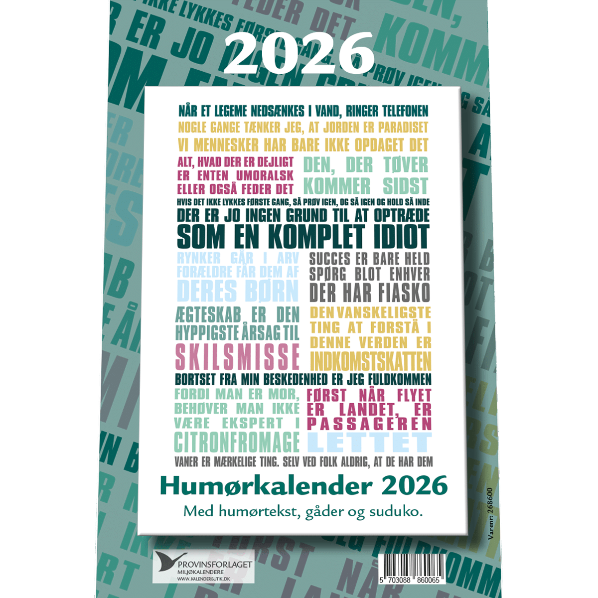 Vægkalender til afrivning i dag pr. side med humørtekst for hver dag, nu også med suduko og gåder på weekender. Format: 12 x 17 cm.