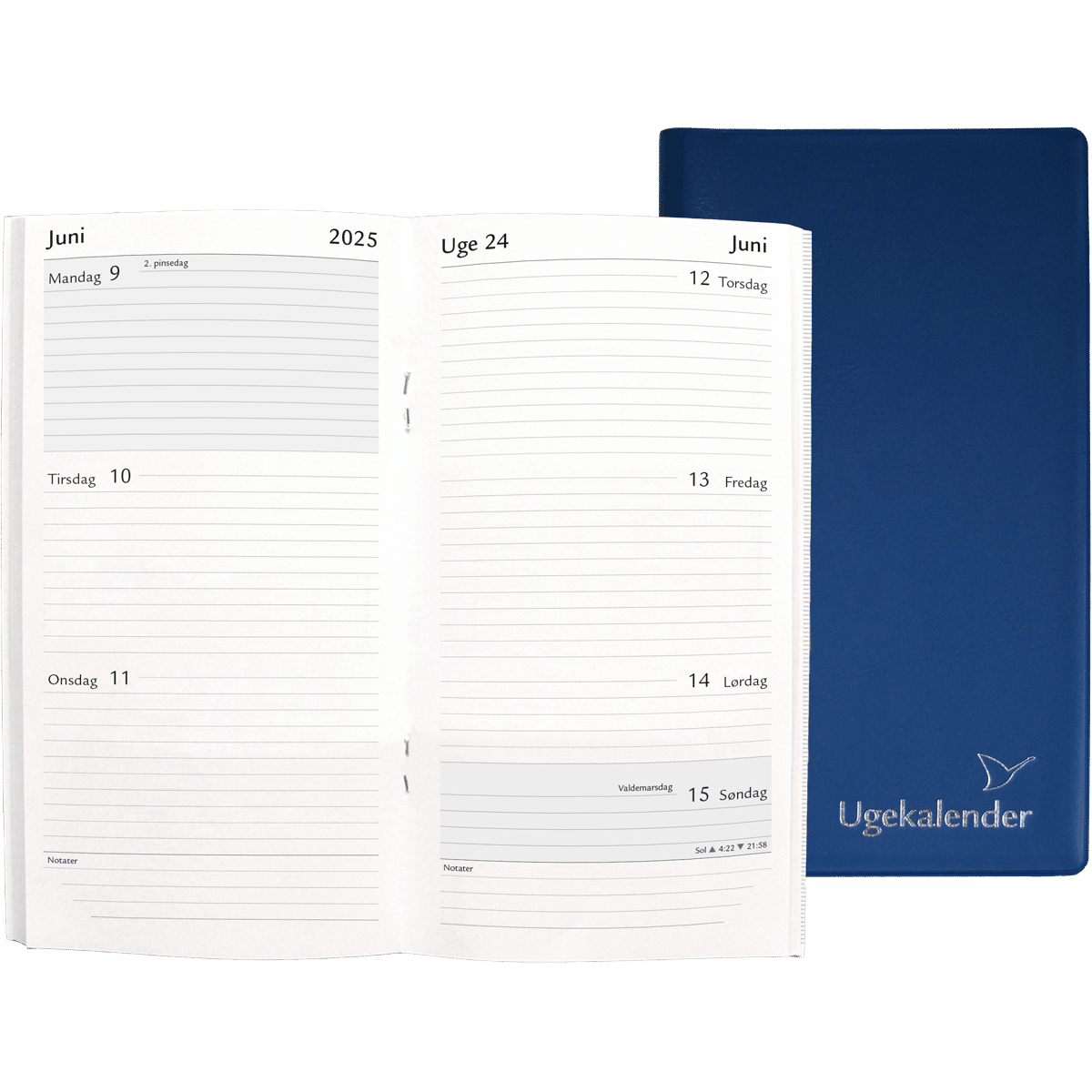 Blåt omslag med klammehæftet ugekalender med god skriveplads. Månedsoversigt efterfølgende år samt infosider med praktiske oplysninger og udfoldningskalender. Format: 10,0 x 17,4 cm.