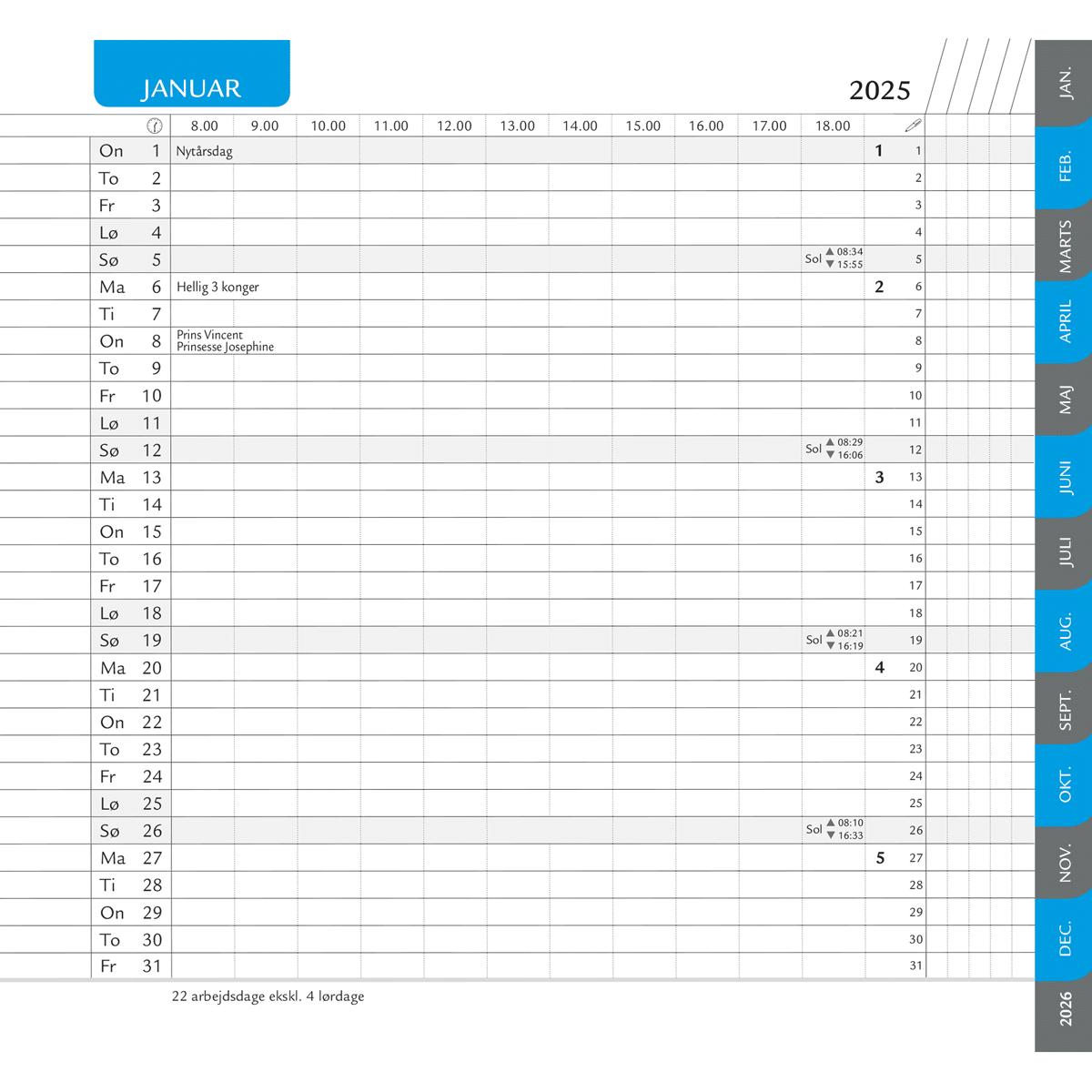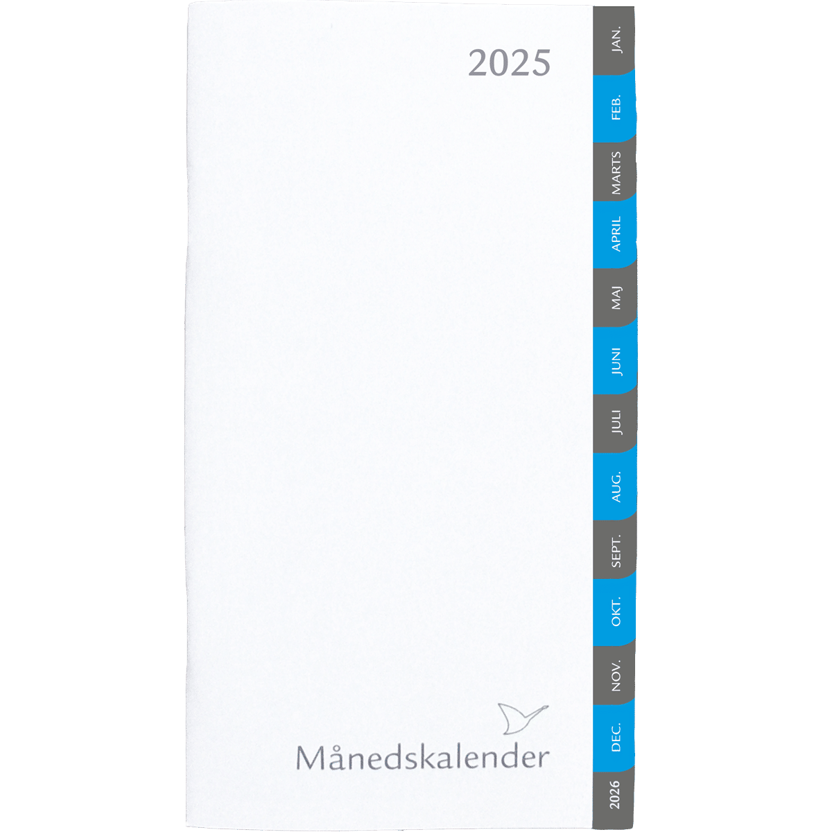 Månedskalender med blå/grå faner. Der er 1 mdr. pr. opslag. Årsoversigt over indeværende samt efterfølgende år. Format: 9,2 x 16,9 cm.