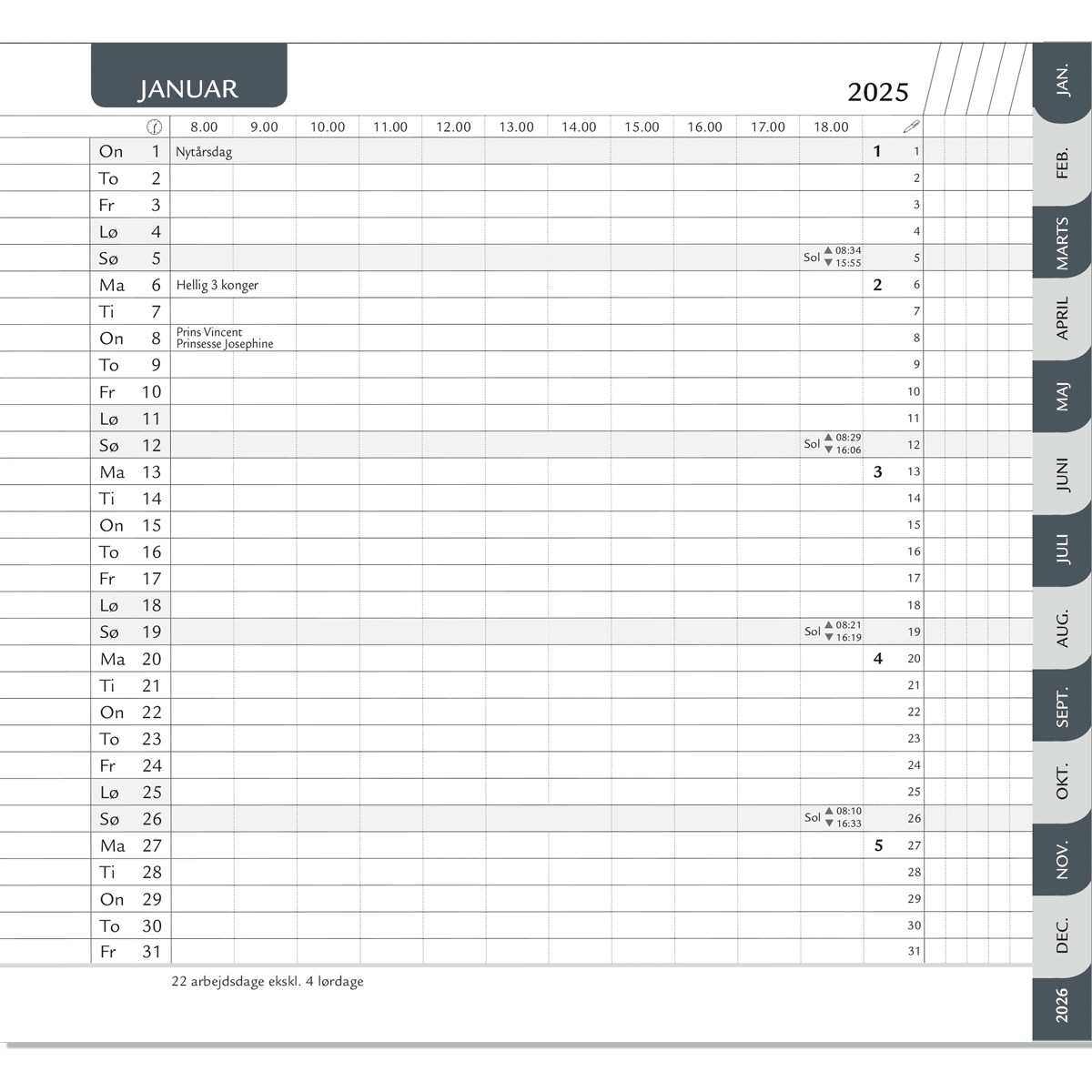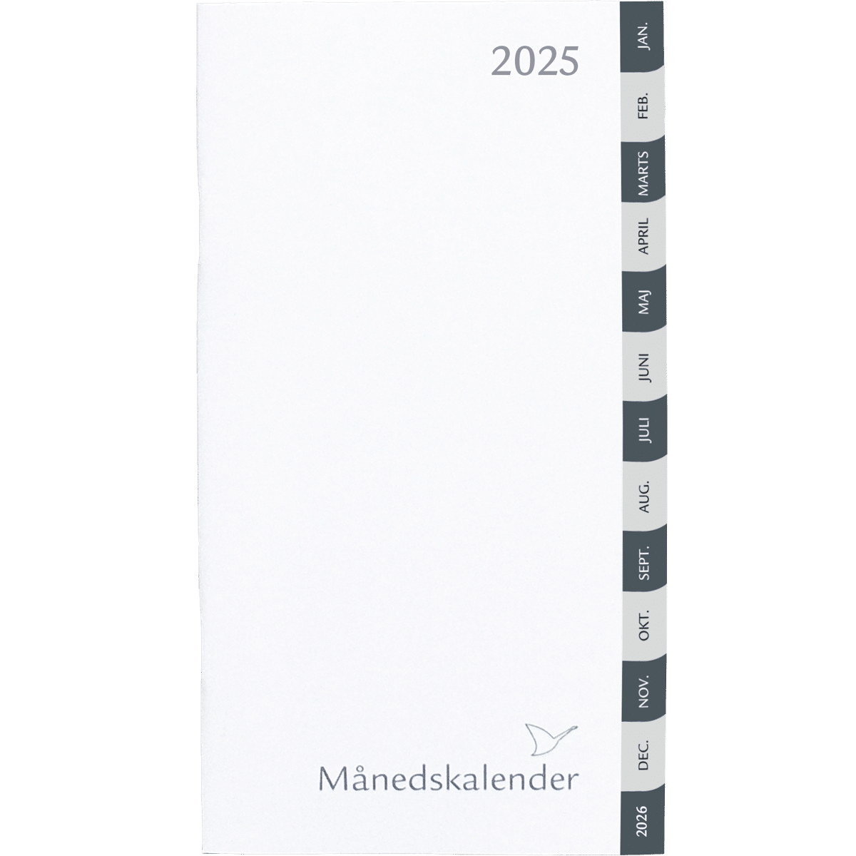 Månedskalender med grå/grå faner. Der er 1 mdr. pr. opslag. Årsoversigt over indeværende samt efterfølgende år. Format: 9,2 x 16,9 cm.