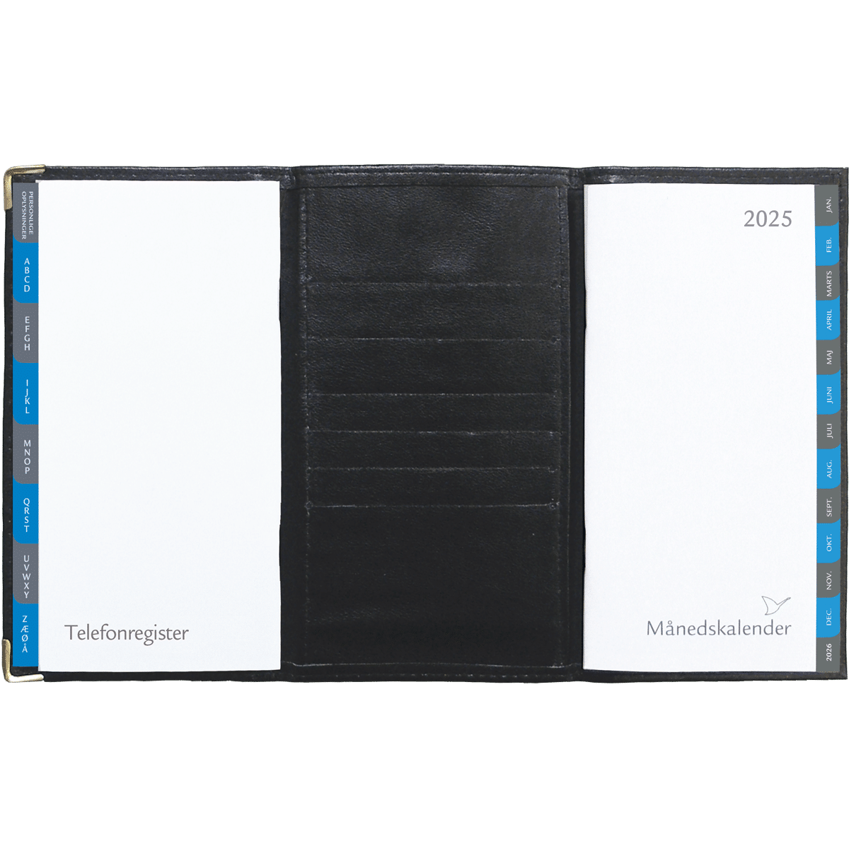 Den flotte 3-fløjet månedskalender med sort kunstlæder omslag giver dig mere overblik over hverdagen.