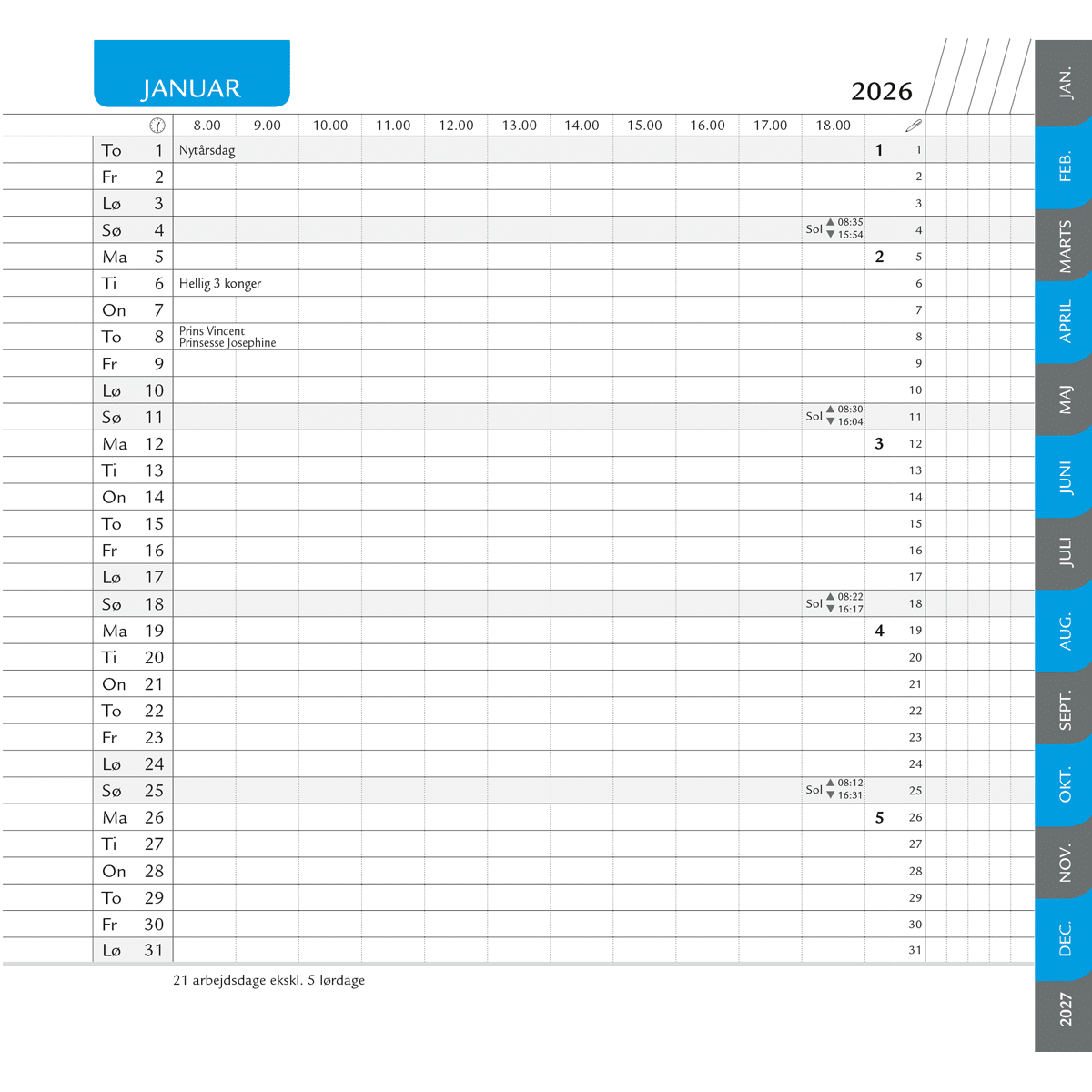 Månedskalender med blå/grå faner. Der er 1 mdr. pr. opslag. Årsoversigt over indeværende samt efterfølgende år. Format: 9,2 x 16,9 cm.