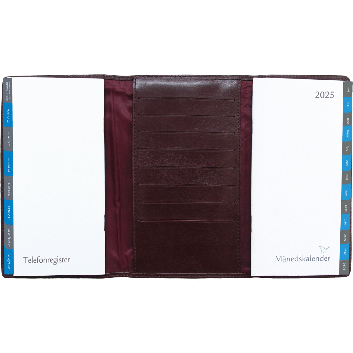 3-fløjet brunt skindomslag med telefonregister og månedskalender. Format omslag: 10,5 x 18,2 cm