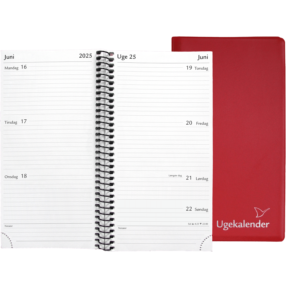Rødt omslag med spiral ugekalender med god skriveplads. Månedsoversigt efterfølgende år samt infosider med praktiske oplysninger og udfoldningskalender. Format: 10,0 x 17,4 cm.