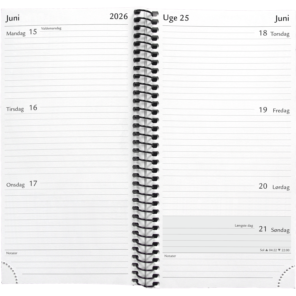 Spiral ugekalender med god skriveplads. Månedsoversigt efterfølgende år samt infosider med praktiske oplysninger og udfoldningskalender. Format: 9,0 x 17,1 cm.