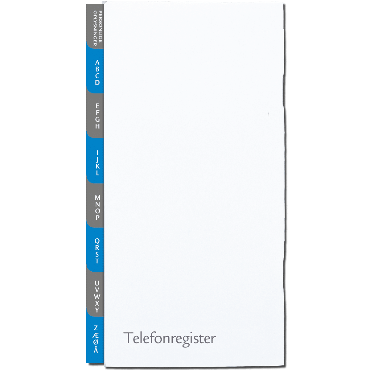 Telefonregister med 16 sider og blå/grå faner A-Å. Format: 9,2 x 16,9 cm.