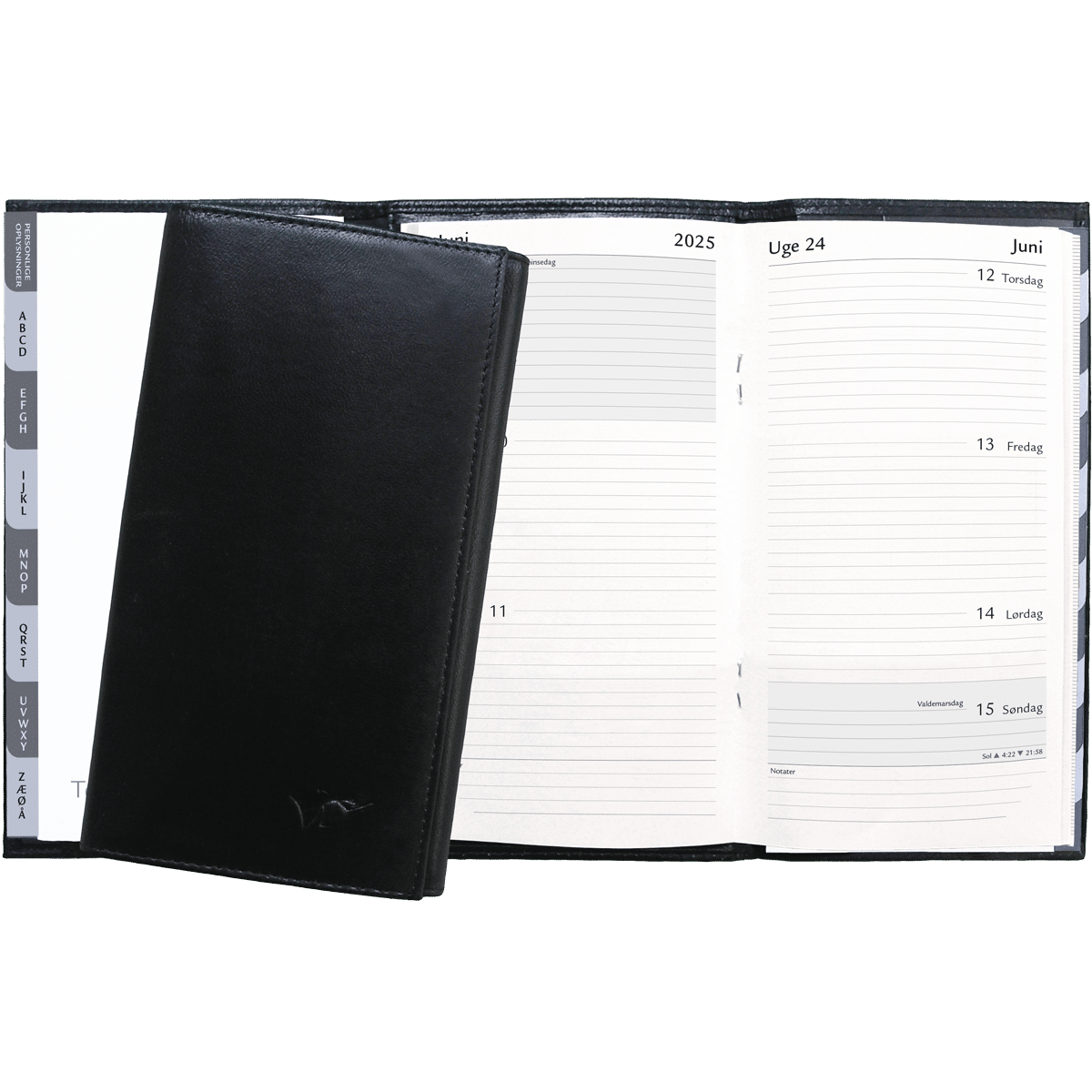 Klammehæftet ugekalender i 3 fløjet sort skindomslag med blok og telefonregiste. Format omslag: 10,5 x 18,2 cm