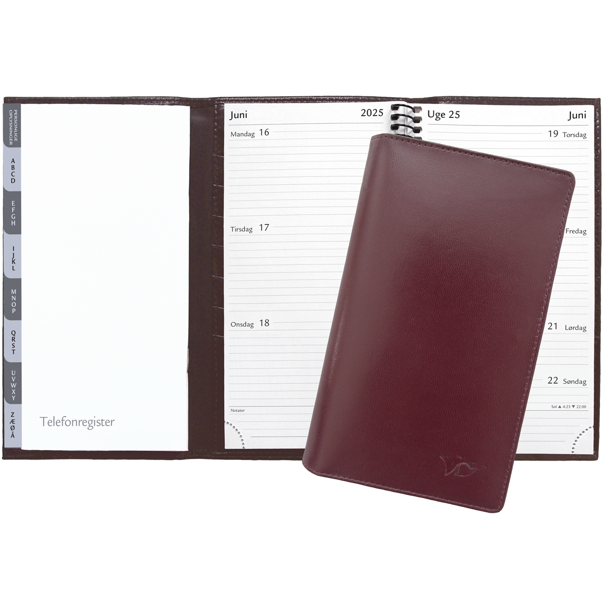 Spiral ugekalender i 3 fløjet skindomslag med blok og telefonregister. Format omslag: 10,5 x 18,2 cm