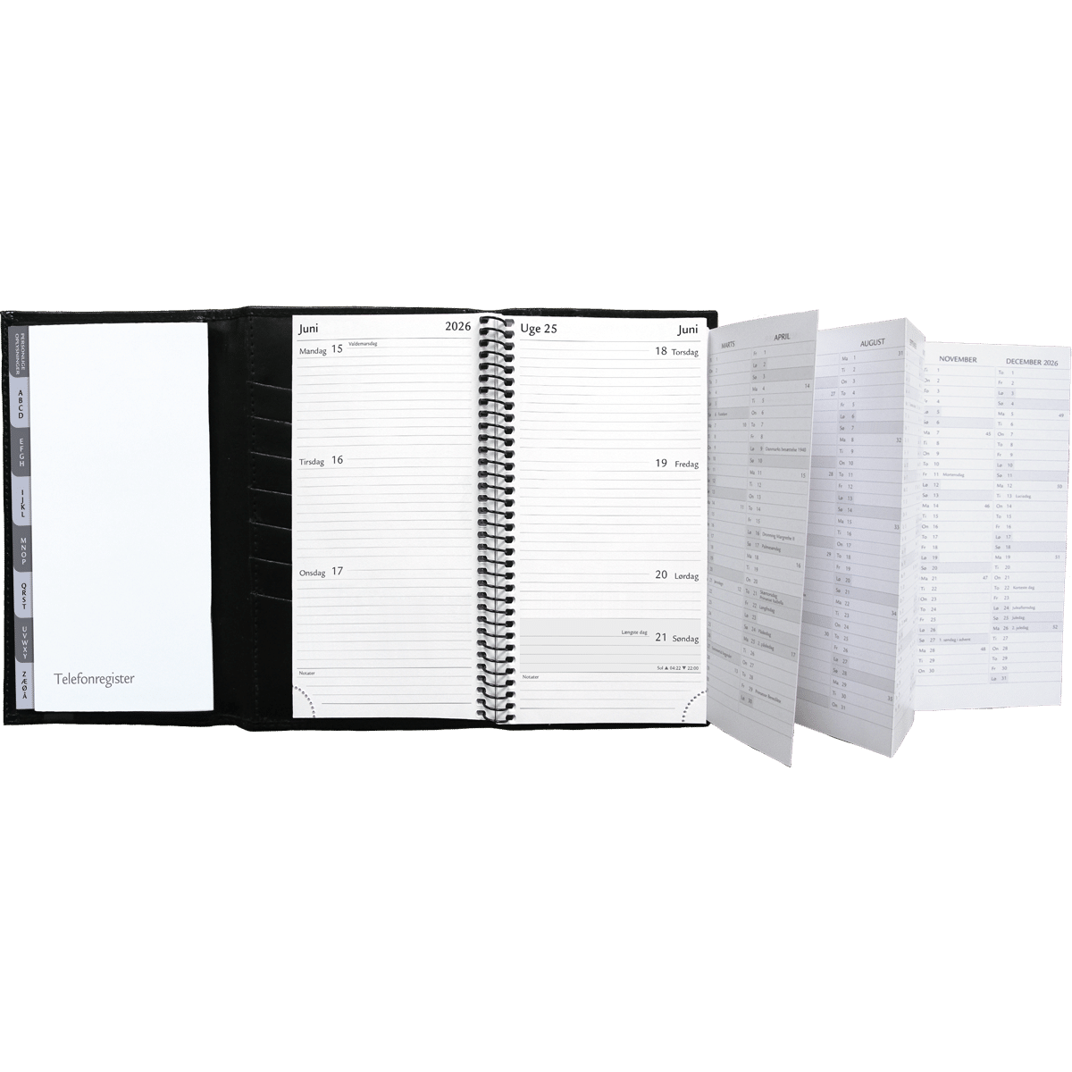 Spiral ugekalender i 3 fløjet skindomslag med blok og telefonregister. Format omslag: 10,5 x 18,2 cm